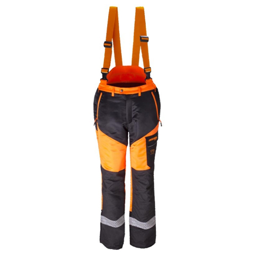 Öt rétegű láncfűrész-védelem a láb elején és 5 cm-es átfedés a bal láb bal és a jobb láb belső varrásán.  Jól látható narancssárga, víztaszító anyag a Cordura?-val kombinálva (könnyű anyag, nagy szilárdsággal és rugalmassággal, könnyen karbantartható, és kopásálló).  Innovatív anyagból készül, amely négy oldalra nyúlik, amely nagy rugalmasságot és kényelmet biztosít.  A térd alatti rész vízálló kevlar szálakból készül, nagy kopásállósággal, víz- és olaj álló.  A Coolmax bélésanyag meleg időben hideg érzést ad.  Fényvisszaverő hevederek a lábakon.  Ideális lábvédelem láncfűrészelésnél. Vágásvédelem: EN381-5, 5 réteg, 1. osztály, 20 m / s.